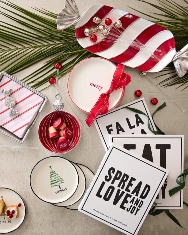 A gorgeous, red ornament-shaped dish, adorned with silver trim, adds a festive spirit to your decorative holiday spread.