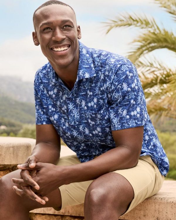 Channel your island spirit with this palm-printed short-sleeve shirt, crafted from a breathable blend with innovative cooling properties, plenty of stretch, and a sleek hidden lens wipe on the interior button placket.