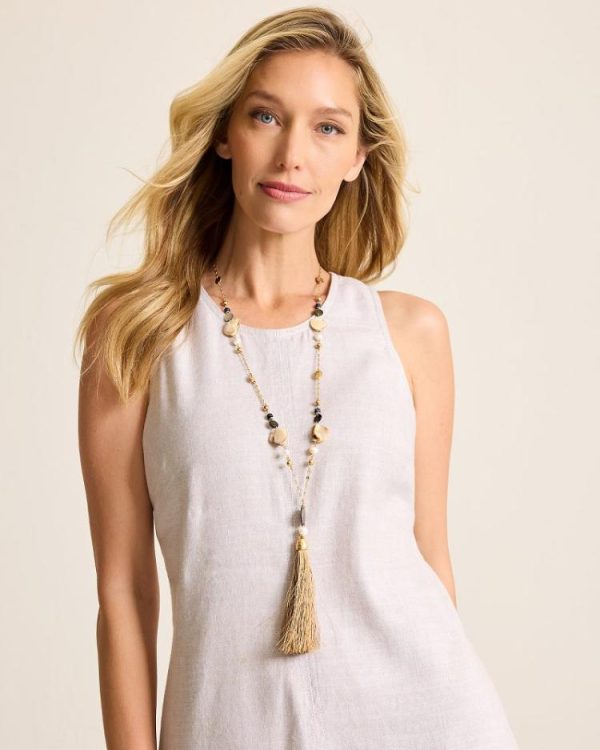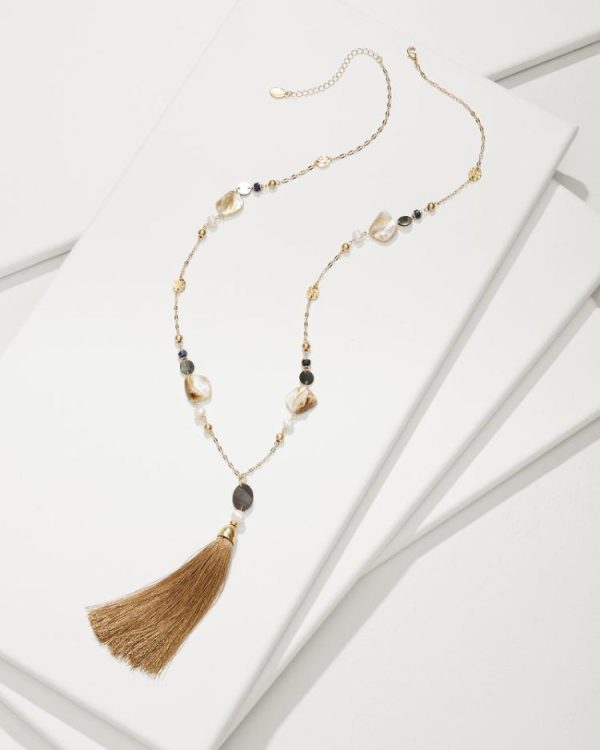 An elongated necklace, featuring earthy-hued shells and a regal tassel detail, is an always-elegant statement for your everyday looks.