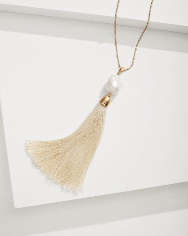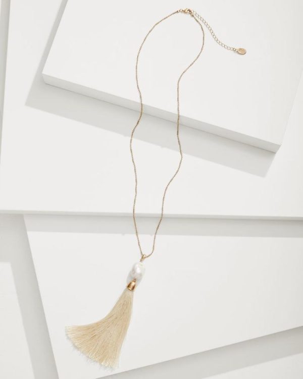 Dramatize your look with an elongated necklace that makes a statement with an elegant pearl charm and glamorous tassel.