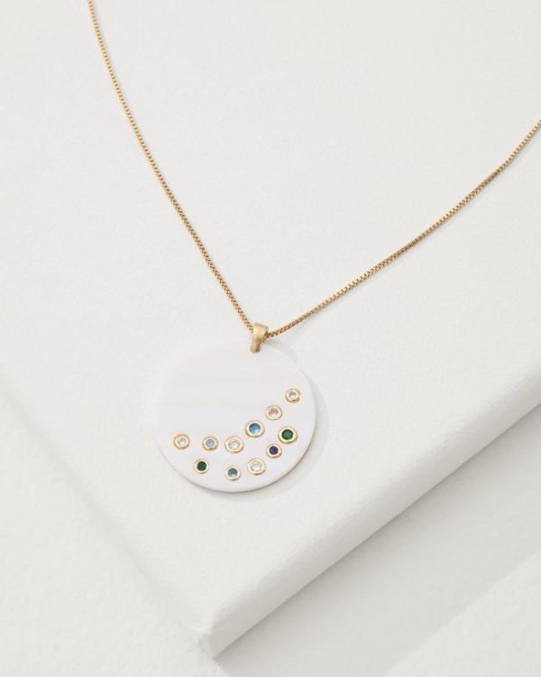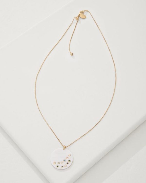 Add an element of interest to your look with this elongated necklace, featuring a chic disc pendant that’s embellished with dainty, colorful shells.
