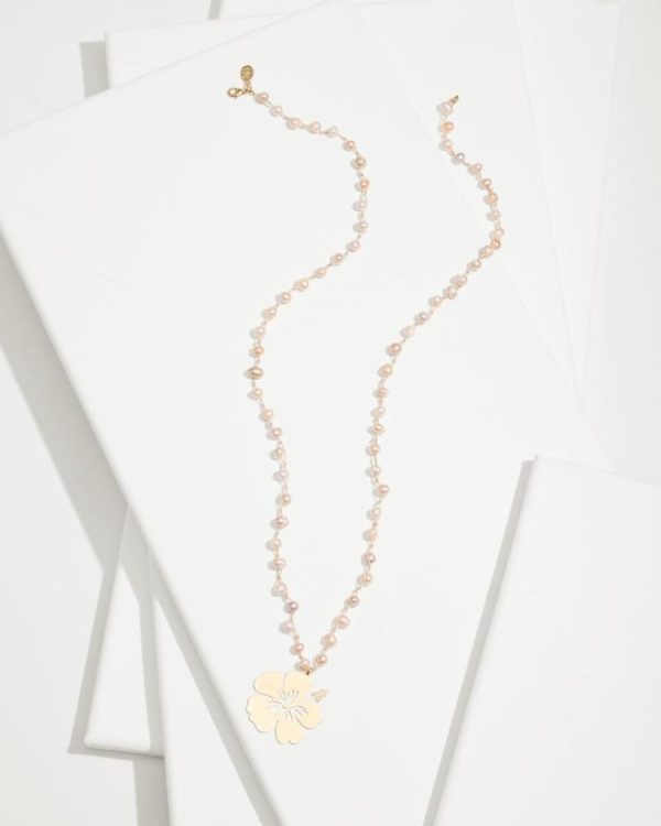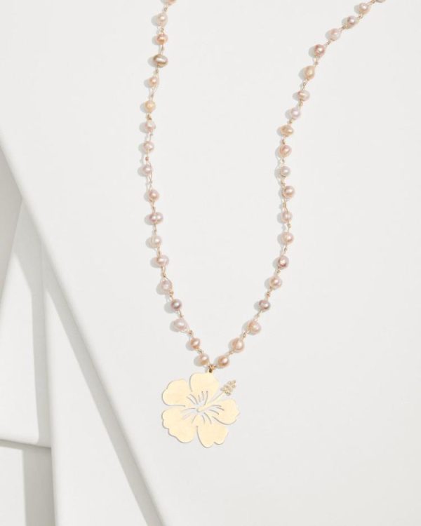 Segmented light pink pearls along an elongated necklace set an effortlessly elegant tone for your look, complete with a delicate gold charm in the shape of a hibiscus.